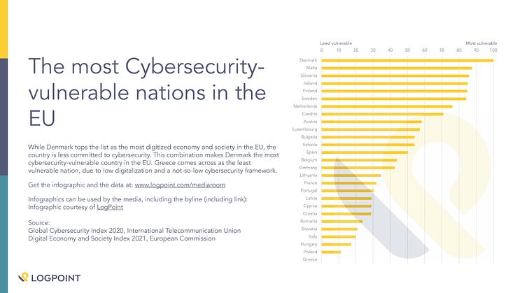 While Denmark tops the list as the most digitized economy and society in the EU, the country is less committed to cybersecurity. This combination makes Denmark the most cybersecurity-vulnerable country in the EU. Greece comes across as the least vulnerable nation, due to low digitalization and a not-so-low cybersecurity framework.