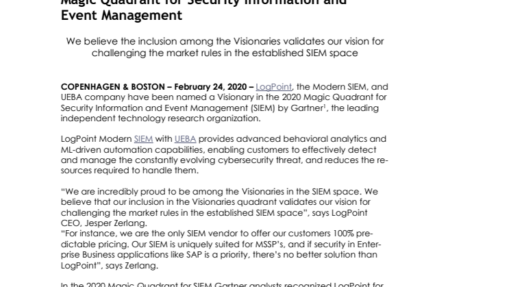 COPENHAGEN & BOSTON – February 25, 2020 – LogPoint, the Modern SIEM, and UEBA company have been named a Visionary in the 2020 Magic Quadrant for Security Information and Event Management (SIEM) by Gartner, the leading independent technology research organization.